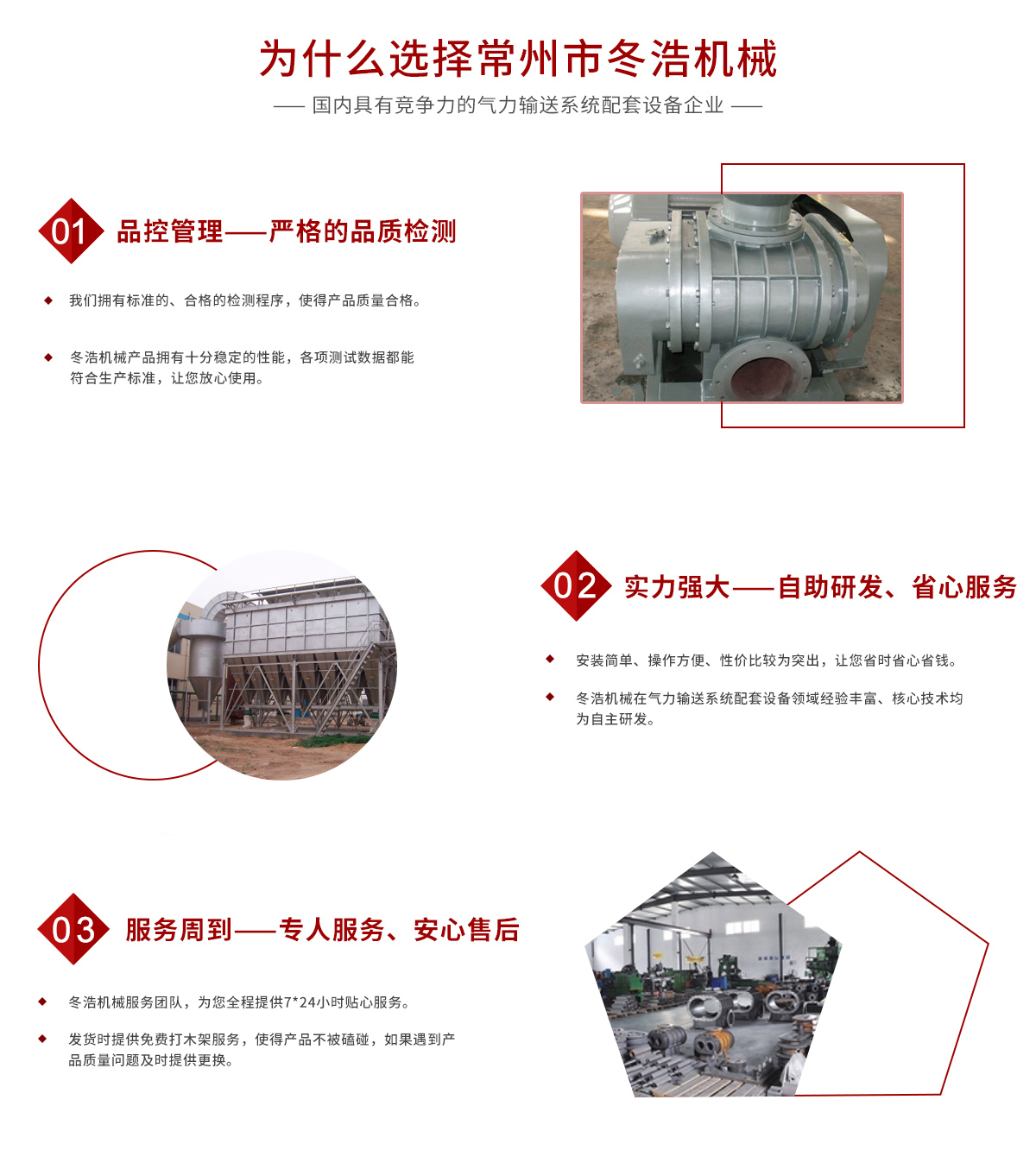 常州市冬浩機械有限公司占地面積5000平方米,擁有一支專業(yè)的科技研發(fā)團隊和配備專業(yè)的生產設備。專業(yè)致力于氣力輸送系統配套設備的研發(fā)、生產及銷售。產品在實際應用中不斷創(chuàng)新、不斷升級,現已對接實現自動化、智能化、人性化。實踐證明公司生產的吸糧機系列、高溫羅茨風機系列、關風機系列、氣力輸送設備系列、特殊工況訂制系列的產品被廣泛運用于石油化工、油脂、化工干燥、除塵、冶金、環(huán)保、電子、煤炭、建筑、電力機械、糧食、飼料等行業(yè)。為解決輸送、搬運等環(huán)節(jié)中節(jié)約大量的人力、財力;從而提高了生產效率。